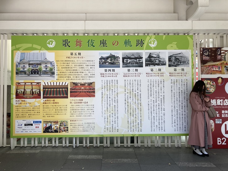 歌舞伎座の入口横に「歌舞伎座の軌跡」というタイトルの案内板が置かれています。