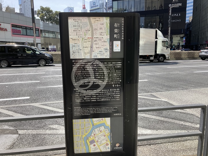 銀座から有楽町に入ります。道路脇に千代田区町名由来板が立っています。千代田区の町名由来板は初めて見たかな?