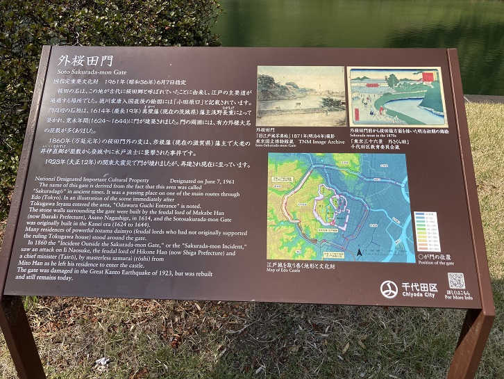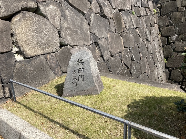桜田の名は、この地が古代に桜田郷と呼ばれていたことに由来し、江戸の主要道が通過する場所でした。徳川家康入国直後の絵図にこは「小田原口」と記載されています。門周辺の石垣は、慶長十九年(1614年)真壁(現在の茨城県)藩主浅野長重によって築かれ、寛永年間(1624年〜1644年)に門が建築されました。門の周囲には、有力外様大名の屋敷が多くありました。万延元年(1860年)の桜田門外の変は、彦根藩(現在の滋賀県)藩主で大老の井伊直弼が屋敷から登城中に水戸浪士に襲撃された事件です。大正十二年(1923年)の関東大震災で門が壊れましたが、再建され現在に至っています。
