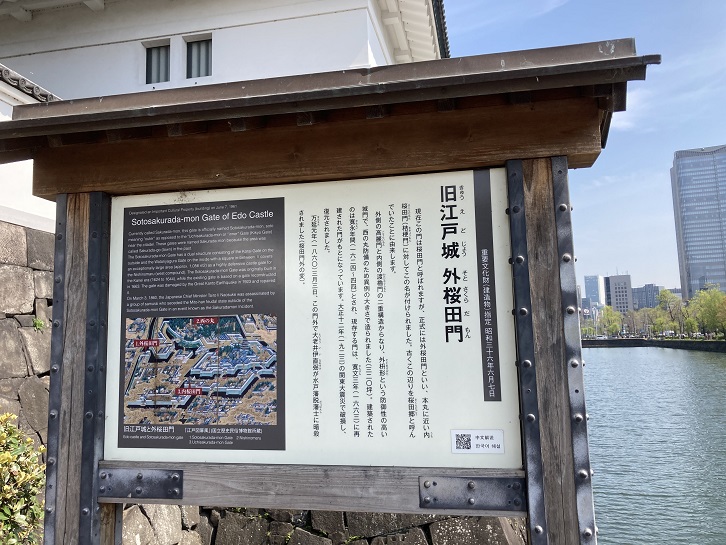 The name of this gate is derived from the fact that this area was called "Sakuradago" in ancient times. It was a passing place on one of the main routes through Edo(Tokyo). In an illustration of the scene immediately after Tokugawa Ieyasu entered the area, "Odawara Guchi Entrance" is noted. The stone walls surrounding the gate were built by the feudal lord of Makabe Han (now Ibaraki Prefecture), Asano Nagashige, in 1614, and the Sotosakurada-mon Gate was originally built in the Kanei era (1624 to 1644). Many residences of powerful tozama daimyo (feudal lords who had not originally supported the ruling Tokugawa house) stood around the gate. In 1860 the "Incident Outside the Sakurada-mon Gate," or the "Sakurada-mon Incident," saw an attack on li Naosuke, the feudal lord of Hikone Han (now Shiga Prefecture) and a chief minister (Tairo), by masterless samurai (roshi) from Mito Han as he left his residence to enter the castle. The gate was damaged in the Great Kanto Earthquake of 1923, but was rebuilt and still remains today.