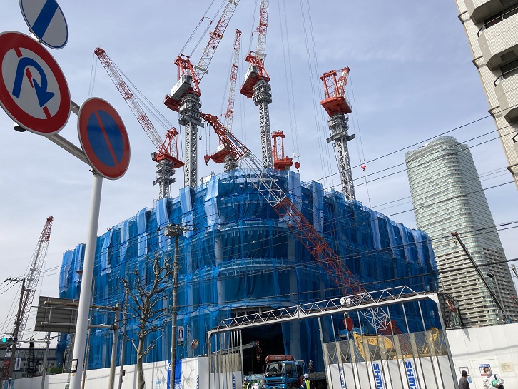 ロシア大使館のはす向かいには飯倉ビルが建っていました。建物の大きさもさることながら、クラシックな外観でかなり目立った存在でした。それが消えてしまっています。飯倉ビルの建物は昭和五年(1930年)に竣工した旧逓信省貯金局の庁舎で、設計は大蔵省営繕管財局、施工は銭高組でした。昭和十八年(1943年)から逓信本省庁舎として使用され、昭和二十四年(1949年)に二省分離(郵電分離)により発足した旧郵政省が昭和四十四年(1969年)7月まで郵政本省庁舎として使用していました。平成三十一年・令和元年(2019年)に飯倉ビルを含む一帯を再開発する「虎ノ門・麻布台地区第一種市街地再開発事業」の開始に伴って解体されました。外苑東通りから見ますと、飯倉ビルの跡地に新しいビルが建つように見えますが、実はこの再開発事業はとんでもない規模なのです。桜田通り・外苑東通り・麻布通りに囲まれた広大な敷地で進められていて、全体の敷地面積は約63,900u、延床面積は約860,400uにも及びます。飯倉ビルの跡地に建つのは、地上64階・地下5階・高さ325m・床面積461,395uのメインタワーです。この他にも2棟の超高層ビルが建てられます。2019年8月5日に着工し、2023年3月末に竣工する予定です。メインタワーは、高さ300mの「あべのハルカス」を抜き、日本一の超高層ビルになりますが、2027年9月には東京駅近くに高さ390mの「TOKYO TORCH」ビルが完成する予定なので、日本一の期間は4年半ほどになる見込みです。