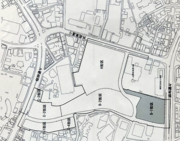 左はA街区に建設中のメインタワー、右は全体の配置図です。