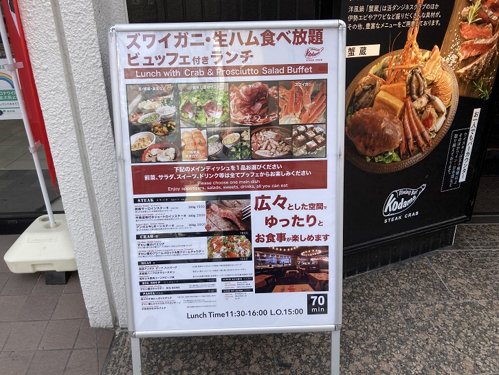 六本木交差点の手前に「ズワイガニ・生ハム食べ放題」の看板を出しているお店があります。「食べ放題」という言葉にめっぽう弱い私ですが、さすがに六本木の高級店での食べ放題には入るのに躊躇します。「ダイニングバル コダマ Steak Crab」は、2019年11月16日にオープンした、総合食品メーカーのコダマが運営するレストランです。肉のプロが目利きした肉料理とアメリカ西海岸より仕入れた蟹料理が売り物です。ランチでは、ステーキ・蟹(パエリア、コロッケ、サンドイッチ)・肉(ハンバーグ、フォアグラごはん他)・パスタ(ミートラザニア、蟹のカルボナーラ)・スープといったカテゴリーが揃えられています。どれを頼んでもサラダビュッフェとドリンクバーが付きます。