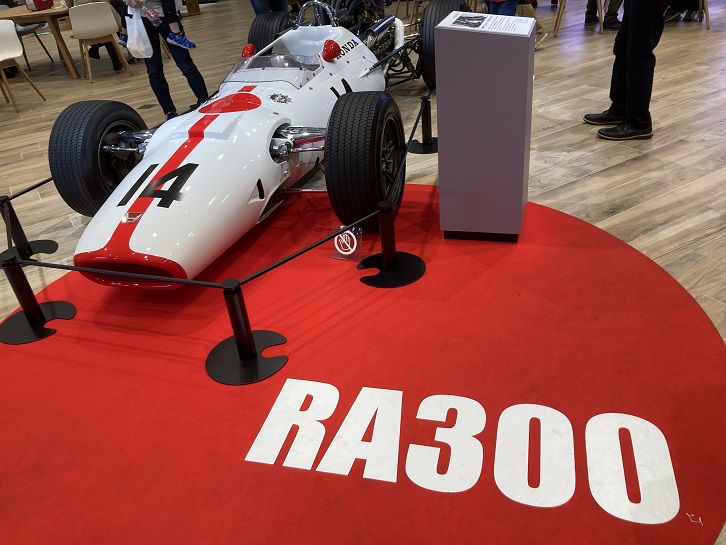 せっかくなので、ショールームを見学することにします。中には本物のF1カーが展示してあり、全て記念すべき節目の年に走った車です。それぞれの車の横に解説板が置かれています。最初は、シャシー・エンジンを含め全て自社製造しフルワークス体制でチームとして参戦した1964年から1968年までの第1期の中で使われたRA300です。