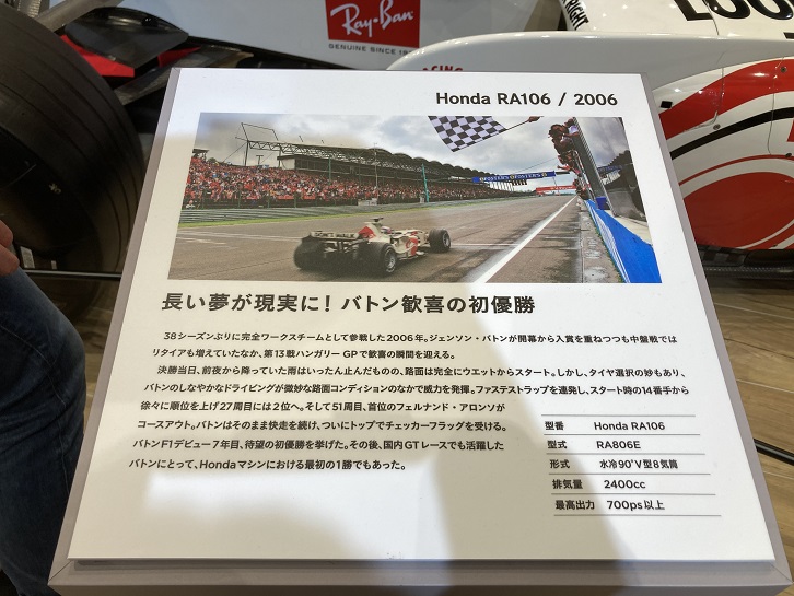 38シーズンぶりに完全ワークスチームとして参戦した2006年。ジェンソン・バトンが開幕から入賞を重ねつつも中盤戦ではリタイアも増えていたなか、第13戦ハンガリーGPで歓喜の瞬間を迎える。決勝当日、前夜から降っていた雨はいったん止んだものの、路面は完全にウエットからスタート。しかし、タイヤ選択の妙もあり、バトンのしなやかなドライビングが微妙な路面コンディションのなかで威力を発揮。ファステストラップを連発し、スタート時の14番手から徐々に順位を上げ27周目には2位へ。そして51周目、首位のフェルナンド・アロンソがコースアウト。バトンはそのまま快走を続け、ついにトップでチェッカーフラッグを受ける。バトンF1デビュー7年目、待望の初優勝を挙げた。その後、国内GTレースでも活躍したバトンにとって、Hondaマシンにおける最初の1勝でもあった。