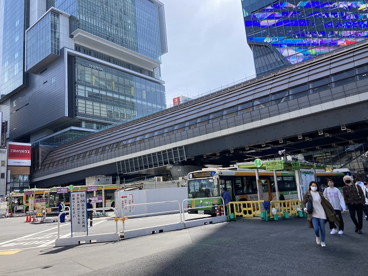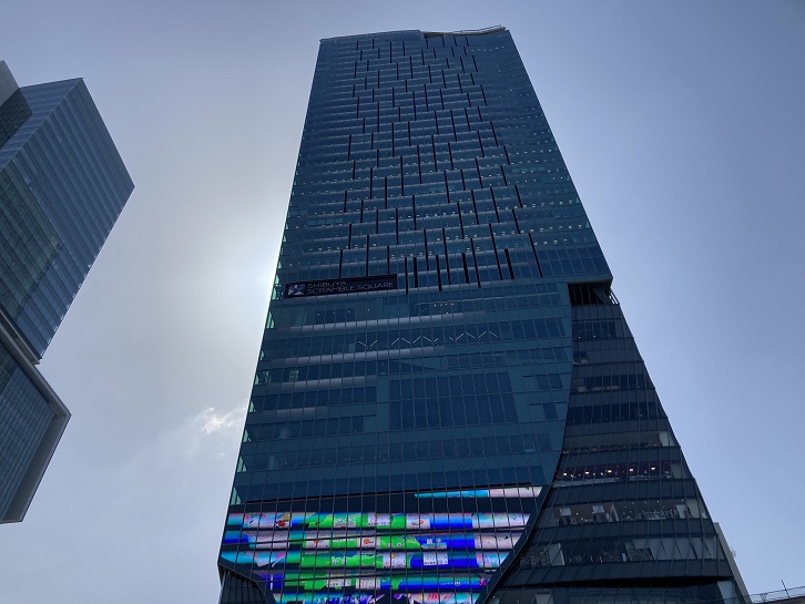 ネットの情報によれば、都電10系統の渋谷電停は何度かの移動を繰り返した後で、現在の渋谷ヒカリエ前辺りに落ち着いたみたいです。私はそこから往復共に宮益坂を経由していたんだろうと思っていましたが、実は都電10系統は渋谷駅前でループ状の線路になっていたのだということが後で分りました。渋谷に向う電車は青山通りから玉川通りに抜ける金王坂を下り、右折して渋谷電停に向かいました。そして、須田町行きの電車は渋谷電停を出発してから地下鉄銀座線の高架の下を通り(地下鉄なのに線路が道路の上にある!)、宮益坂下交差点で右折して宮益坂を登って行ったのです。そんな訳で、今日は渋谷電停跡だと思っていた東口の都営バス乗り場からスタートします。渋谷スクランブルスクエアビルの窓硝子は巨大なスクリーンになっています。スクリーンの裏側で仕事をされる人にはどのように見えるのでしょうか?