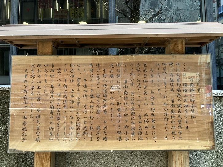 変更前の都電10系統でもご紹介したのですが、御嶽神社で新たな案内板を見つけました。明治天皇が駒場野の練兵場を視察された際に御嶽神社で休息をとられ、それを記念したもののようです。