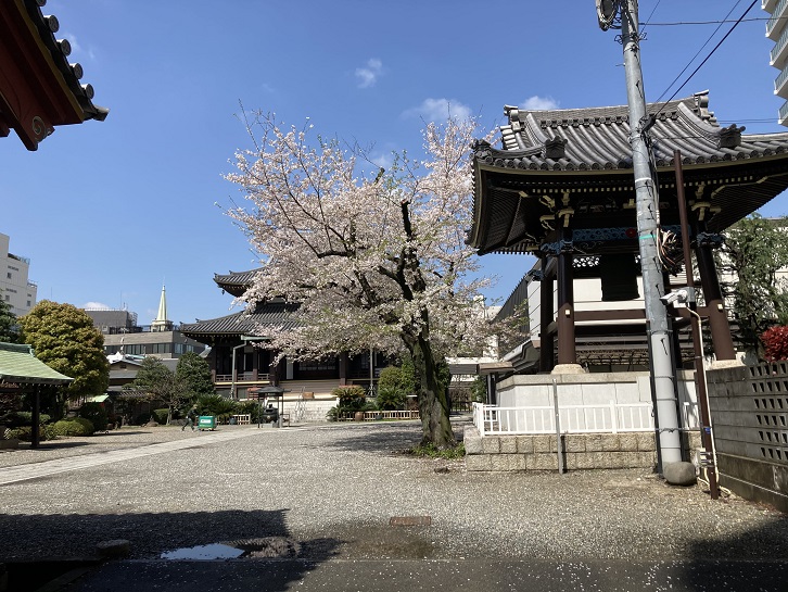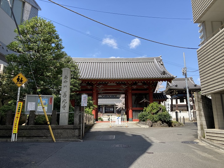 表参道交差点から入った路地の奥に善光寺というお寺があります。現在の青山は江戸時代には善光寺の門前町でした。一帯には各大名家の下屋敷が存在し、大山道(現在の青山通り)も通っていました。創立当初の善光寺は尼寺で、かつては谷中にありました。谷中の伽藍は元禄十六年(1703年)11月29日に小石川水戸邸を火元とする大火(元禄地震による火事)によって焼失し、その後徳川吉宗から青山に朱印地を拝領し、現在の場所に間口75間・奥行100間の堂宇を新築して宝永二年(1705年)12月に移転してきました。境内の桜が満開になっていますね。