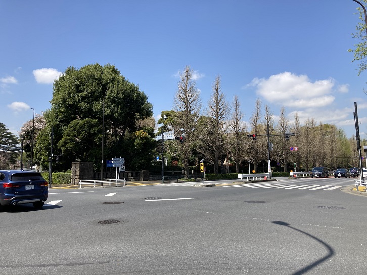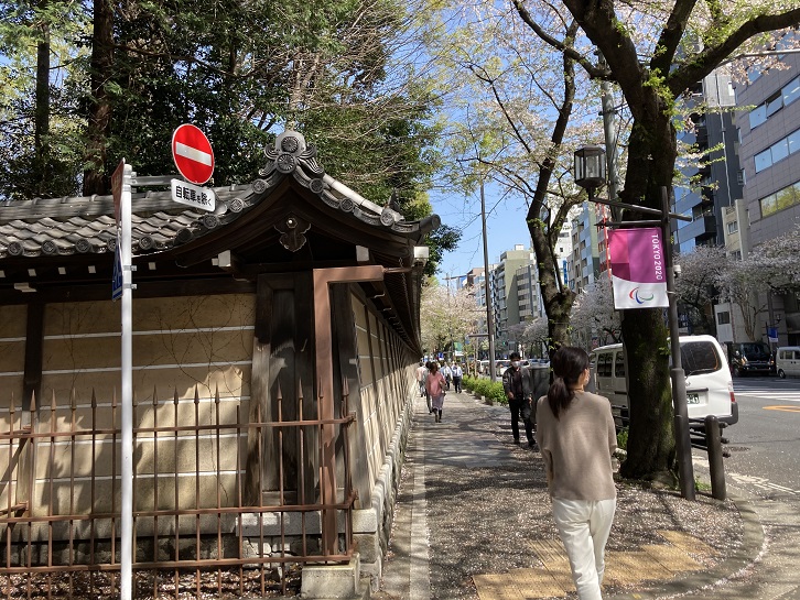 青山一丁目交差点を左折し、赤坂御用地の石塀に沿って進みます。御用地の桜も満開になっていますね。