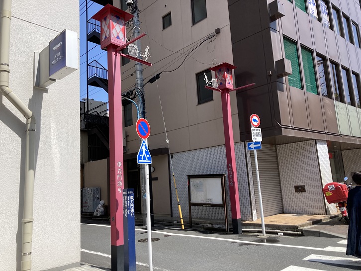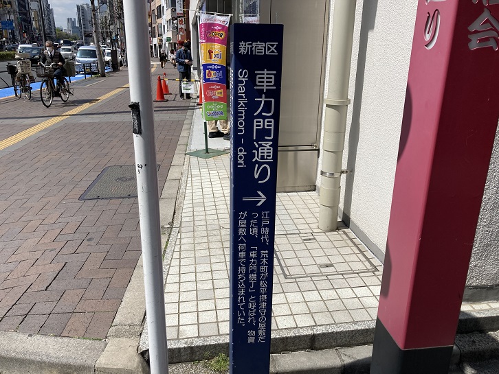 車力門通りは、江戸時代に松平摂津守の上屋敷があり、屋敷内に物資を荷車で運んでいたことからこの名称が付いたようです。通りの入口の門柱には、荷車を引いた人物のレリーフが飾り付けられています。