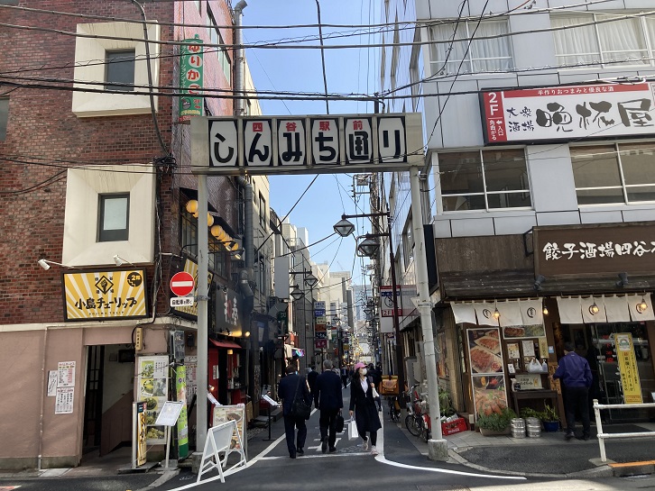 「しんみち通り」は、四谷見附交差点のすぐ傍に位置し、外堀通りと直角に接して新宿方向に伸びているわずか100mほどの短い路地で、四谷駅前地区の中心的歓楽ゾーンとなっています。この通りは車一台が通れるほどの道幅しかなく、日中は飲食店が建ち並んでいるだけの大して特色のない通りに見えますが、夜になると町の雰囲気は一変します。焼鳥屋・割烹・小料理屋・カラオケスナックなどの店も多いので、地域や隣接地の麹町方面から人が繰り出してきて飲食街らしい賑わいをみせます。飲食街としての性格を強めだしたのは、昭和三十九年の東京オリンピックの頃からで、それ以前は八百屋・魚屋・履物屋・床屋などの店が多く、新宿通りよりも遙かに賑やかな地域の商店街としての存在でした。しかし、今ではビル化が進んで店舗数は約120店ほどになり、このうちの8割が飲食店舗になっています。飲食店舗には、喫茶・中国料理・洋食レストラン・西洋料理などの他、メキシコ・スリランカ・アジア・アフリカ料理などのエスニック料理の店も見かけられます。この他には、スペイン料理の店やフランスやドイツのワインハウスもあります。路地裏の飲食街にこれだけの外国料理の店が存在するのは珍しいといえます。