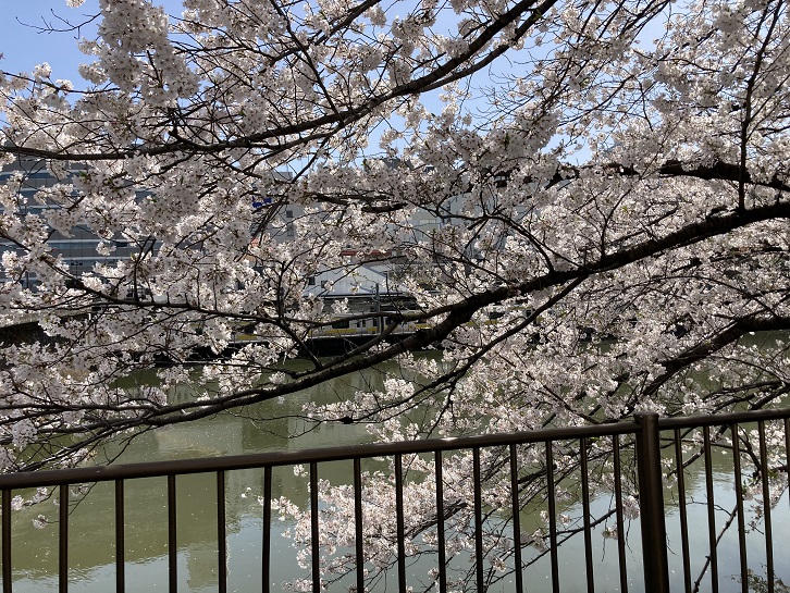 今年は例年にも増して桜の開花が早かったですね。既に葉桜になっているところもありますが、お花見の名所として知られる外堀通り沿いの桜並木は今が満開のようです。お濠の水とピンクの花がよく合います。