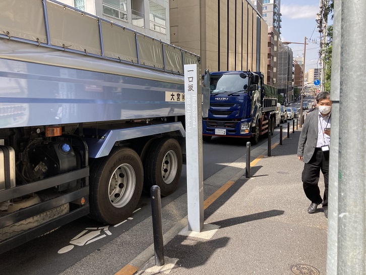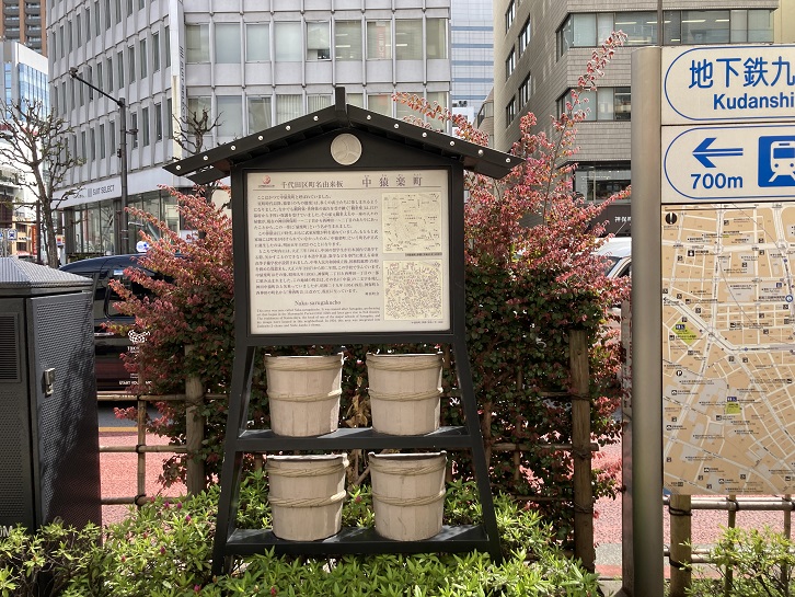 靖国通りに沿って、町会が設置した地元町名の案内板が立っています。木樽には消火用の水が入っているのかな?それとも、単なる重し?