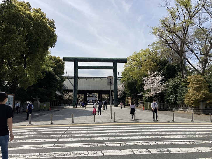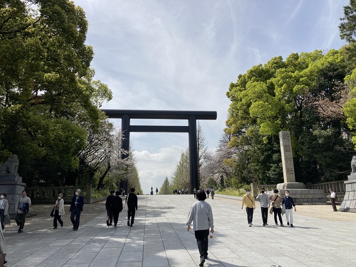 靖国通りは、靖国神社の前を通ることから、昭和三十七年(1962年)に「大正通り」から改名されました。その年に都内69の道路に愛称を制定しましたが、その多くは地元である程度浸透していた通称を採用したのだそうです。「靖国通り」も昭和三十年代の時点ですでにそのように呼ばれていました。この改名がなかったら、「明治通り」・「大正通り」。「昭和通り」・「平成通り(中央区の東京証券取引所前から築地二丁目に至る南北の通り)」と、元号に対応した道路の愛称名が全て都内23区内に存在したのですけどね。ただ、都内ということであれば、吉祥寺に「大正通り」という名称の道路があるそうですが。ちなみに、「令和通り」という名称の道路は全国唯一山口市にあるようです。靖国神社の長い塀に沿って進みますと、靖国通りに面して南門があります。そこから境内に入りますと、左手に第二鳥居が見えます。その奥は、神門・中門鳥居・拝殿・本殿と続いています。