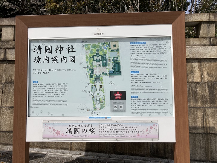 田安門交差点から再び靖国神社の境内に入ってみます。目の前には第一鳥居(大鳥居)が聳えています。高さ25.00m・柱直径2.50m・円周7.85m・笠木(上の横木)の長さ34.13m・笠木の直径2.70m・柱間の幅19.56m・重さ100tで、8階建てのビルに相当するのだそうです。現在の大鳥居は二代目ですが、初代の大鳥居は神社の創建50年にあたる1921年に日本一の大鳥居として造立されました。高さ21.03m・柱直径1.88m・笠木の長さ29.74m・笠木の直径2.06m・柱間の幅17.94mだったそうです。青銅製で第二次世界大戦の敗色が濃くなった昭和十八年(1943年)に「風雨による老朽化」を理由に撤去され、資材は軍事物資として供出されました。1974年10月に再建されるまで、代わりにヒノキの鳥居が立っていました。初代の鳥居は青銅製でしたが、再建された鳥居は当時の最新技術の耐候性鋼で造られました。日本最高・最大級の大鳥居で、震度7の地震・風速80mの風にも耐え、耐用年数は1200年にも及ぶそうです。32世紀に建替えるときに日本はどうなっているのでしょうか?大鳥居の奥に大村益次郎の像が立っています。1893年に大熊氏広によって制作された日本初の西洋式銅像とのことです。大村益次郎は幕末期の長州藩出身で、兵部省初代大輔(次官)を務め、日本陸軍の創始者と見なされています。靖国神社に銅像が建ったのもその功績を称えるためなのでしょう。参道入口の横に「靖國神社境内案内図」の案内板が立っています。