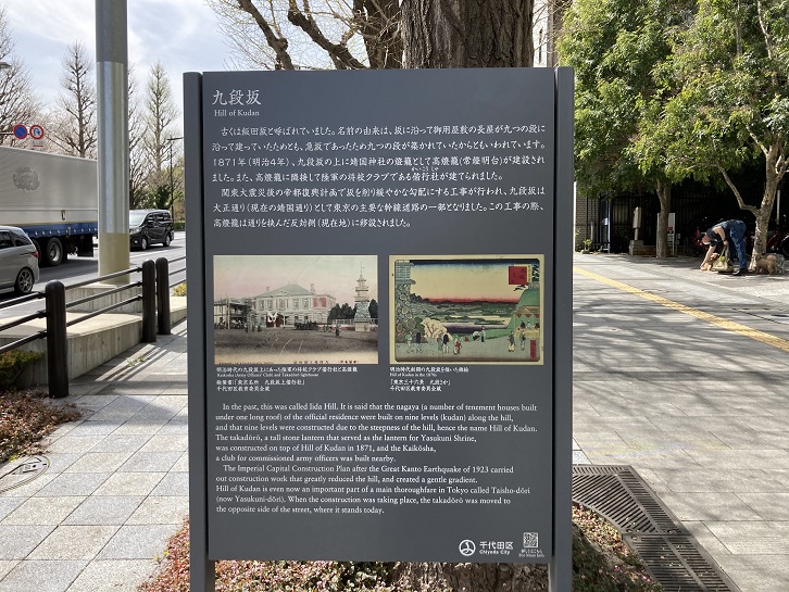 In the past, this was called Iida Hill. It is said that the nagaya (a number of tenement houses built under one long roof) of the official residence were built on nine levels (kudan) along the hill, and that nine levels were constructed due to the steepness of the hill, hence the name Hill of Kudan. The takador0, a tall stone lantern that served as the lantern for Yasukuni Shrine, was constructed on top of Hill of Kudan in 1871, and the Kaikosha, a club for commissioned army officers was built nearby. The Imperial Capital Construction Plan after the Great Kanto Earthquake of 1923 carried out construction work that greatly reduced the hill, and created a gentle gradient. Hill of Kudan is even now an important part of a main thoroughfare in Tokyo called Taisho-dori (now Yasukuni-dori). When the construction was taking place, the takadoro was moved to the opposite side of the street, where it stands today.