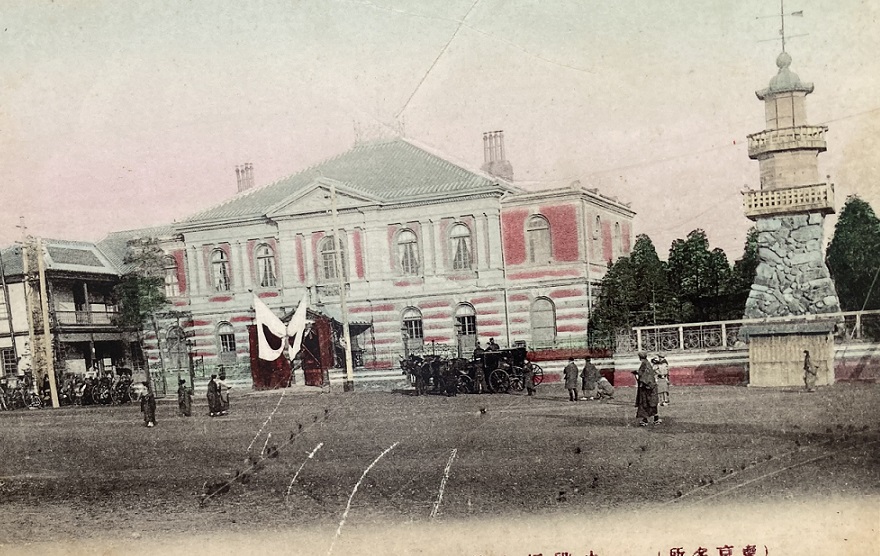 明治時代の九段坂上にあった陸軍の将校クラブ偕行社と高燈籠