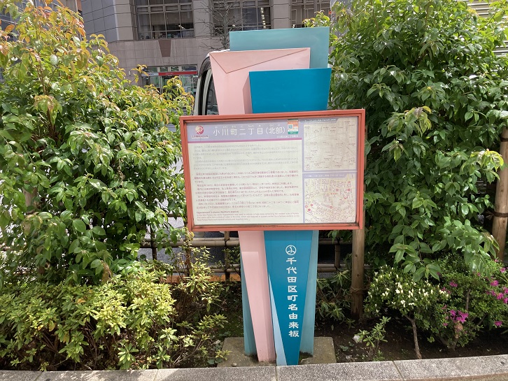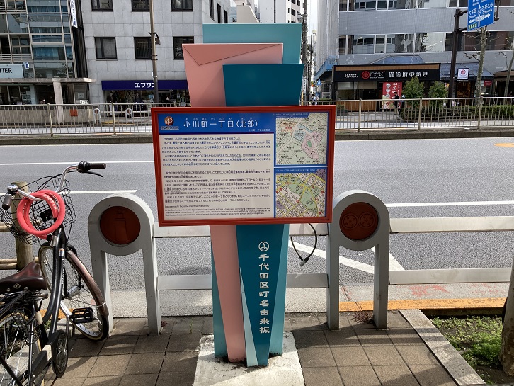 もうひとつ、町会が設置した案内板が立っています。ここは小川町二丁目なのですが、隣の一丁目にも同じような町名案内板があるのです。