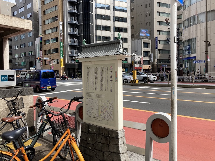 淡路町にも町名の案内板があります。江戸時代に武家屋敷が多かったためか、当時屋敷を構えていた武家の名前が町名に残されています。