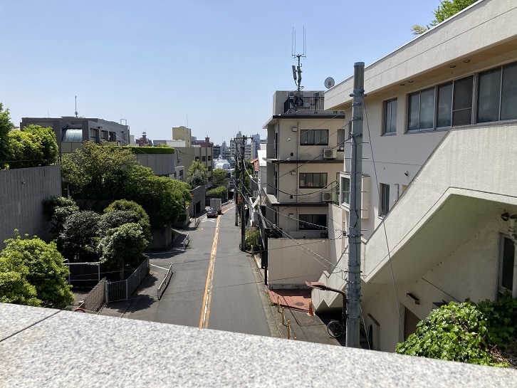 間坂に戻って更に進みますと、聖ヶ丘教会に突き当たり、道路はT字型になっています。ここは南平台の名で知られる都内でも有数の高級住宅地です。左手に進みますと、森のような緑の木々の中に邸宅とかマンションが散在しています。