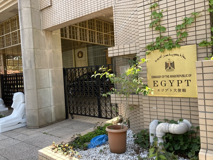 各国の大使館はそれぞれのお国をアピールすべく趣向を凝らしています。エジプトといえばピラミッドとミイラですよね。大使館の入口には、古代エジプト王朝の壁画に描かれた人物像に似た像が2体置かれています。二人とも男性みたいですけど、座り込んでおしゃべりでもしているのでしょうか?イヤ、きっと酒盛りの最中でしょう。