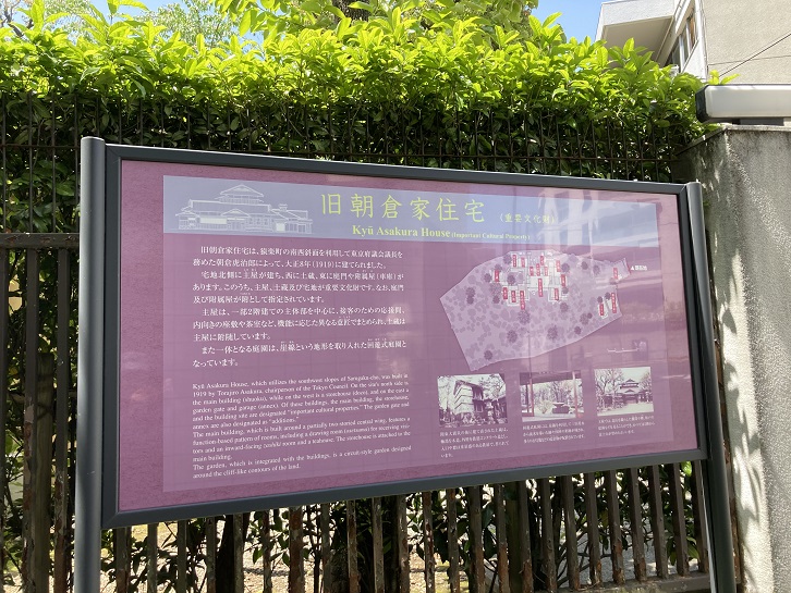 Kyu Asakura House, which utilizes the southwest slopes of Sarugaku-cho, was built in 1919 by Torajiro Asakura, chairperson of the Tokyo Council. On the site's north side is the main building (shuoku), while on the west is a storehouse (dozo), and on the east a garden gate and garage (annex). Of these buildings, the main building, the storehouse, and the building site are designated "important cultural properties". The garden gate and annex are also designated as "additions". The main building, which is built around a partially two-storied central wing, features a function-based pattern of rooms, including a drawing room (osetsuma) for receiving visitors and an inward-facing zashiki room and a teahouse. The storehouse is attached to the main building. The garden, which is integrated with the buildings, is a circuit-style garden designed around the cliff-like contours of the land.