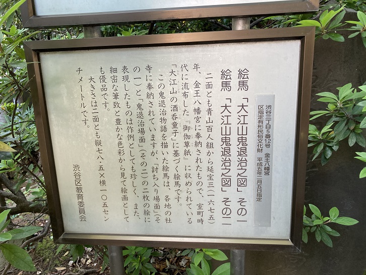 ニ面とも青山百人組から延宝三年(1675年)、金王八幡宮に奉納されたもので、室町時代に流布した「御伽草紙」に収められている「大江山の酒呑童子」に基づく絵馬です。この鬼退治物語を描いた絵馬は、各地の社寺に奉納されていますが、「討ち入り場面」(その一)と「鬼退治場面」(そのニ)のニ枚の絵に表現したものは作例としても珍しく、また、細密な筆致と豊かな色彩から見て絵画としても優品です。大きさは二面とも縦78.5x横105センチメートルです。