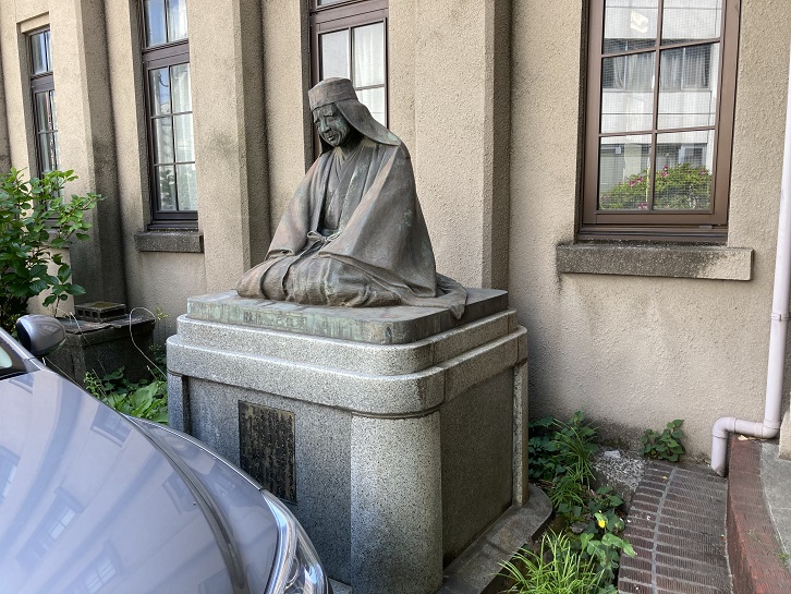 広尾高等学校前交差点を左折し、広尾(町名は東ですが)の閑静な住宅地を進みます。左手に古風な建物があります。入口には「温故学会会館」と書かれた表札が出ています。温故学会?聞いたことがありませんね。入口の奥には銅像が置かれています。琵琶法師のような姿格好ですが、誰なのでしょうか?実は、温故学会会館は「登録有形文化財」に指定されているほど歴史的に価値あるの建物なのです。温故学会会館は、「群書類従」の版木(総数17,244枚に及ぶ国の重要文化財)を管理・保存する目的で、斎藤茂三郎初代理事長が渋沢栄一・三井八郎右衛門(三井総領家当主)ら各界の著名人に呼びかけ、全国からの協賛を得て昭和二年3月に完成しました。温故学会会館は鉄筋コンクリート二階建で、正面からは鳳凰が両翼を広げたような形をしています。関東大震災の経験を生かし建設された会館は、すでに80年を経ていますが、空襲にも耐えたずっしりとした風格は今日でも変わりません。