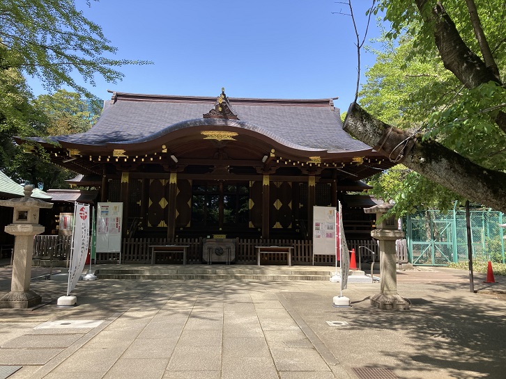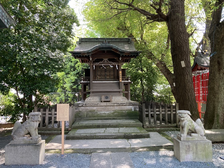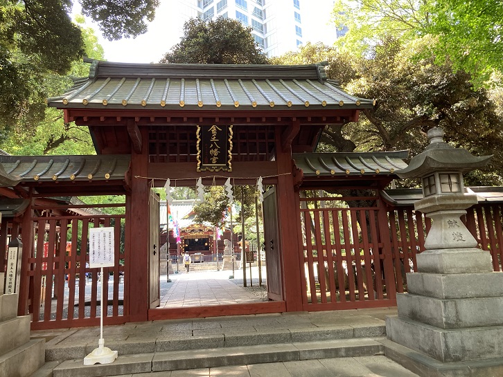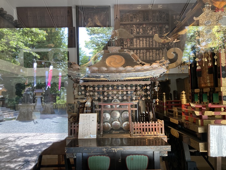 社務所の隣の宝物殿に二基の神輿が保管・展示されています。右側は三年に一度の例大祭で渡御に使われている鳳輦(ほうれん:元々は「屋根に鳳凰の飾りのある天子の車」という意味ですが、現在では「神社の祭りなどに使われる鳳凰の飾りがある神輿」を意味します)、左側は展示のみとなっているようですが本社神輿です。さすが渋谷・青山の総鎮守、鳳輦は立派な神輿ですね。重くて担ぐには難しいのか、牛車に乗せて渡御するみたいです。本社神輿は都内に現存する最古の神輿といわれています。これには伝説が残っています。追手は鎌倉から目黒まで追いかけてきたのですか!鎌倉八幡宮にとって余程大事な神輿だったのでしょう。