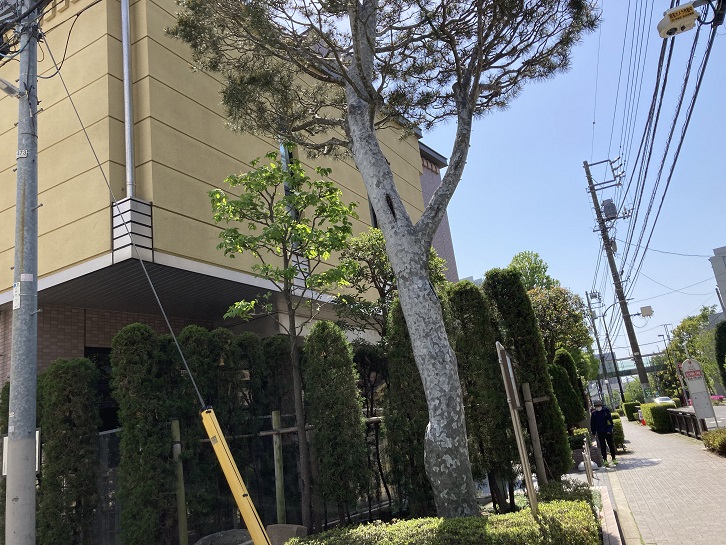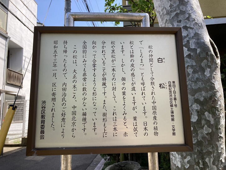 松の仲間として分類された中国原産の植物で「しろまつ」とも呼ばれています。日本の松とは幹の皮の感じが違いますが、葉は似ています。しかし、個々の葉をよくみると、赤松や黒松が二本なのに対して、これは三本に分かれていることが特徴です。また、樹形も上に向かって合掌するような形になっています。全国的にみても非常に数の少ない稀種です。この松は、大正の末ごろ、中国北京から持ち帰ったもので、内田治氏のご好意により昭和五十三年一月、区に寄贈されました。