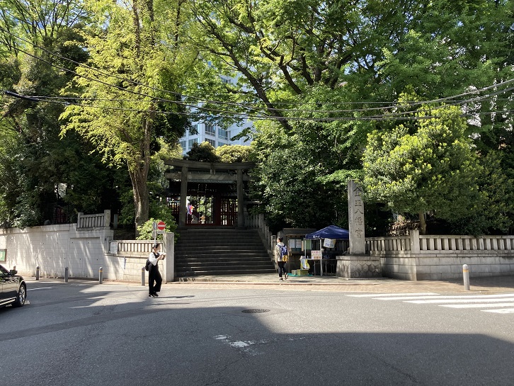 通りの突き当たりに金王八幡宮社の鳥居と社殿が見えます。さすが青山・渋谷の総鎮守だけあって立派な鳥居です。参道の先には社殿に続く階段があります。