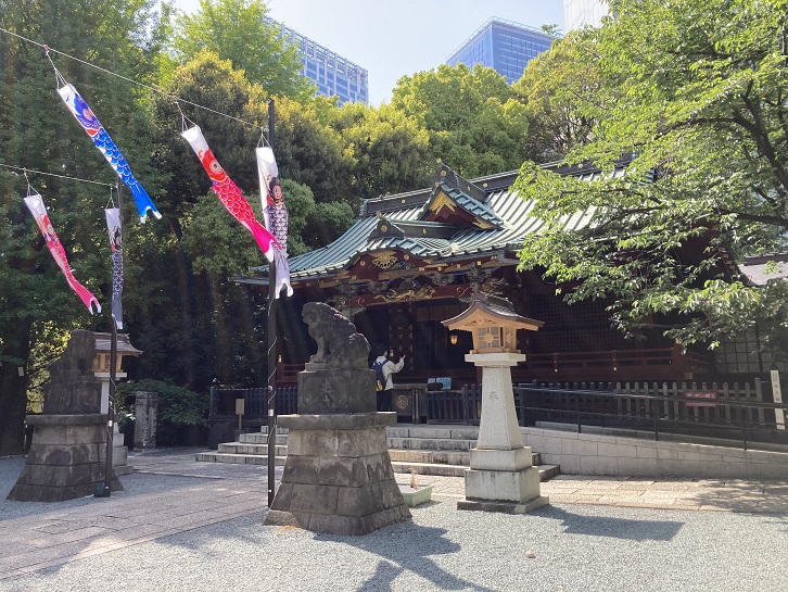 端午の節句が近いこともあって、境内にはミニ鯉のぼりが渋谷の空を泳いでいます。昔は黒い真鯉はお父さん、赤い緋鯉は子供達を表わしていたそうですが、男女同権の波は鯉のぼりにも押し寄せ、今では赤い緋鯉はお母さんに代わり、子供達は青鯉になっています。青鯉は何て読むのでしょうか?童謡の「こいのぼり」も歌詞を変えないといけませんね。
