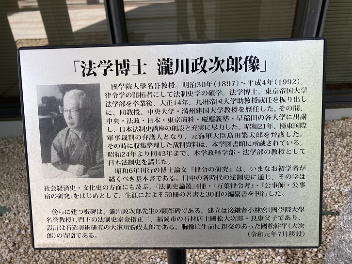 傍らに建つ板碑は、瀧川政次郎先生の顕彰碑である。建立は後継者小林宏(國學院大學名誉教授)、門下の法制史家金指正三、福岡市の石材店主國松大次郎・良康父子であり、設計は石造美術研究の大家川勝政太郎である。胸像は生前に親交のあった國松幹平(大次郎)の寄贈である。
