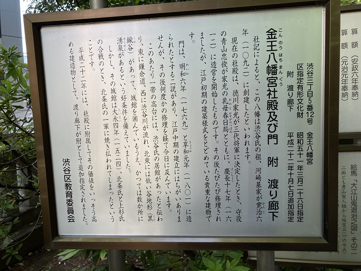 境内の一角に巨大なレコード(現代風にはCD)を祀ったような祠があります。平安時代末期から鎌倉時代初期の武将だった金王丸(こんのうまる)を祀っています。金王丸は澁谷家当主だった澁谷重家の子で、17歳の時に源義朝に従って保元の乱で手柄を立て、その名を轟かせました。金王丸は義朝の死後、土佐坊昌俊と名を変え頼朝に仕えたといわれています。土佐坊昌俊は頼朝と弟の義経が対立した時、頼朝の命を受けて御家人の誰もが嫌った義経暗殺の刺客となって京都に上り、義経の堀川館を夜討ちにしましたが返り討ちにあい逃げ込んだ鞍馬山で義経の郎党に捕らえられ六条河原で処刑されました。澁谷氏は澁谷城内に宇佐八幡を勧請して渋谷八幡宮を創建しましたが、後に金王丸の名声によって金王八幡宮と称されるようになりました。