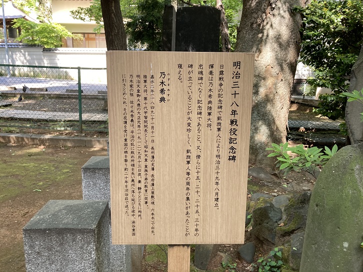 乃木希典は、日露戦争において日本軍がロシア帝国の旅順要塞を攻略し陥落させた戦いを指揮しましたが、彼の遙か先祖は平治の乱に敗れて所領を失い、奥州へ落ち延びる途中でここ澁谷荘で過ごしたことがあるそうです。そういう経緯で境内には乃木希典が揮毫した日露戦争の記念碑が立っています。