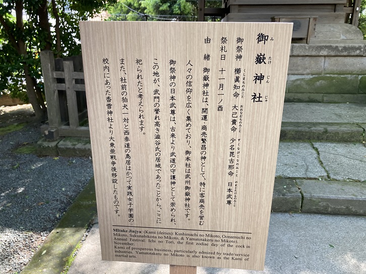 御嶽神社は、開運・商売繁盛の神として、特に客商売を営む人々の信仰を広く集めており、御本社は武州御嶽神社です。御祭神の日本武尊は、古来より武道の守護神として崇められ、この地が、武門の誉れ高き澁谷氏の居城であったことから、ここに把られたと考えられます。また、社前の狛犬一対と西参道の鳥居はかつて実践女子学園の校内にあった香雪神社より大東亜戦争後移設したものです。