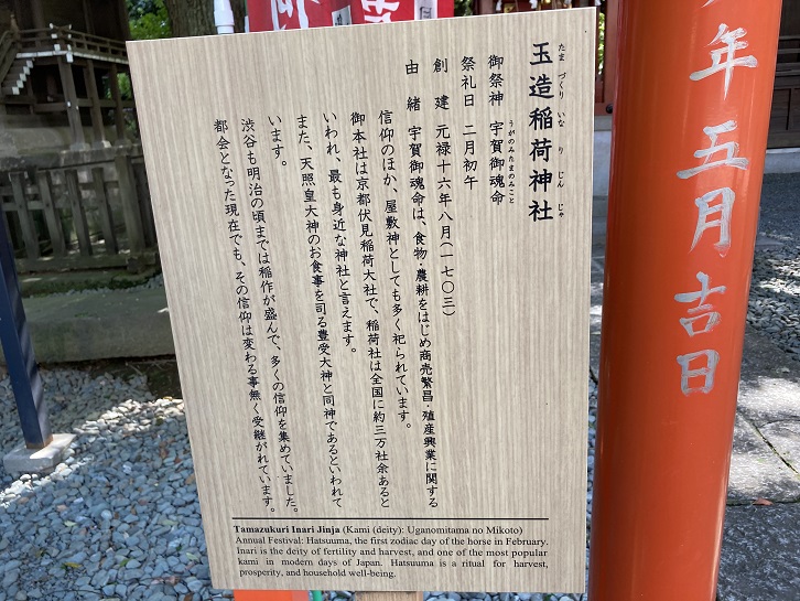 宇賀御魂命は、食物・農耕をはじめ商売繁盛・殖産興業に関する信仰のほか、屋敷神としても多く祀られています。御本社は京都伏見稲荷大社で、稲荷社は全国に約三万社余あるといわれ、最も身近な神社と言えます。また、天照皇大神のお食事を司る豊受大神と同神であるといわれています。渋谷も明治の頃までは稲作が盛んで、多くの信仰を集めていました。都会となった現在でも、その信仰は変わる事無く受継がれています。