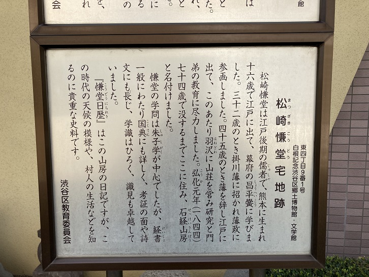 「五輪塔・傘屋の碑・聖観音」の案内板は板碑とは無関係で、実物は博物館に保管されているものと思われます。松崎慊堂宅地跡はこの博物館が建っている場所なのでしょうか?