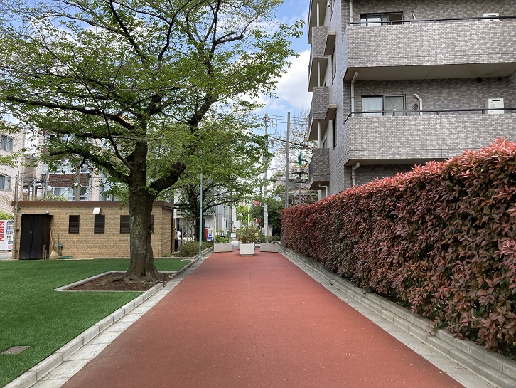 六号坂通りを進んで行きますと、左手に赤い塗装を施した細い道が延びています。神田川笹塚支流の流路跡を遊歩道にしたものです。ちなみに、神田川笹塚支流は「東京の河川を歩く」で真っ先に踏破したのですが、何故か掲載するのを忘れていました。西新宿のド真ん中を流れていた希少な川だったのに、何で書き忘れたんだろう?