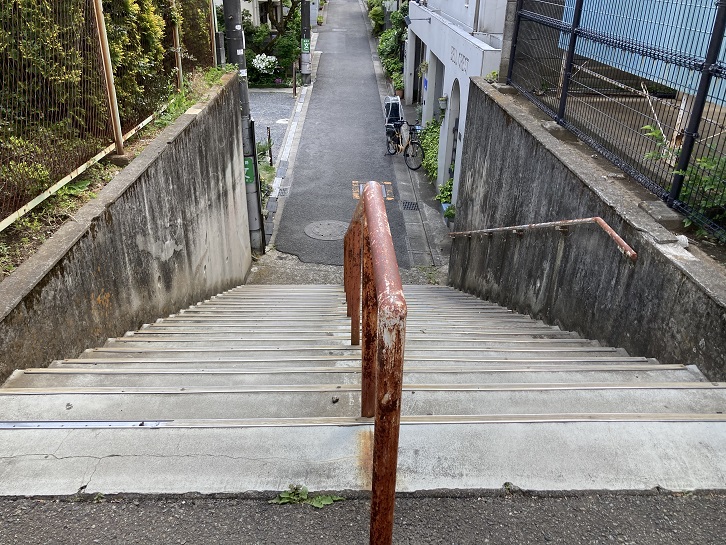 渋谷本町学園を過ぎて更に路地を南方向に進みます。最終的に水道道路に突き当たるのですが、水道道路は周囲よりも一段高い土手の上を通っていますので、横断するには階段を上ってまた下りなければなりません。そういうわけで、水道道路にはあちこちに階段が設けられているのです。車は階段を上れませんので、車道と交差する道路は坂道になっています。道路が傾斜していますので、当然両側の建物も傾斜に合わせて建てられています。
