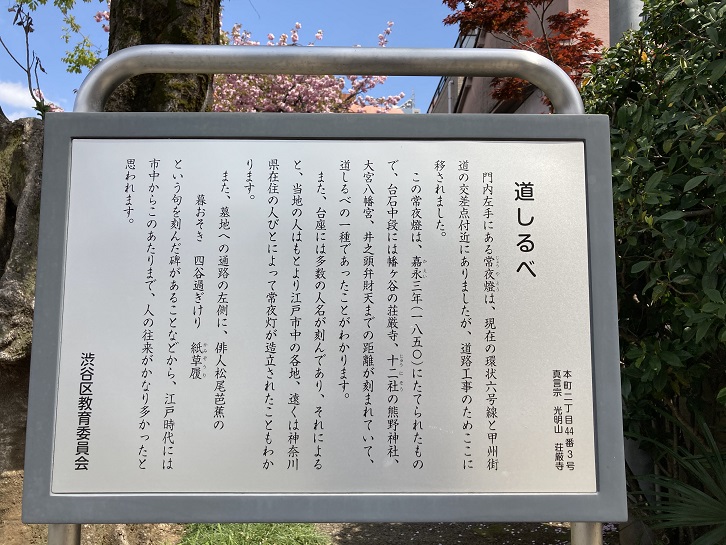 門内左手にある常夜燈は、現在の環状六号線(山手通り)と甲州街道の交差点付近にありましたが、道路工事のためここに移されました。この常夜燈は、嘉永三年(1850年)にたてられたもので、台石中段には幡ヶ谷の荘厳寺、十二社の熊野神社、大宮八幡宮、井之頭弁財天までの距離が刻まれていて、道しるべの一種であったことがわかります。また、台座には多数の人名が刻んであり、それによると、当地の人はもとより江戸市中の各地、遠くは神奈川県在住の人びとによって常夜灯が造立されたこともわかります。また、墓地への通路の左側に、俳人松尾芭蕉の