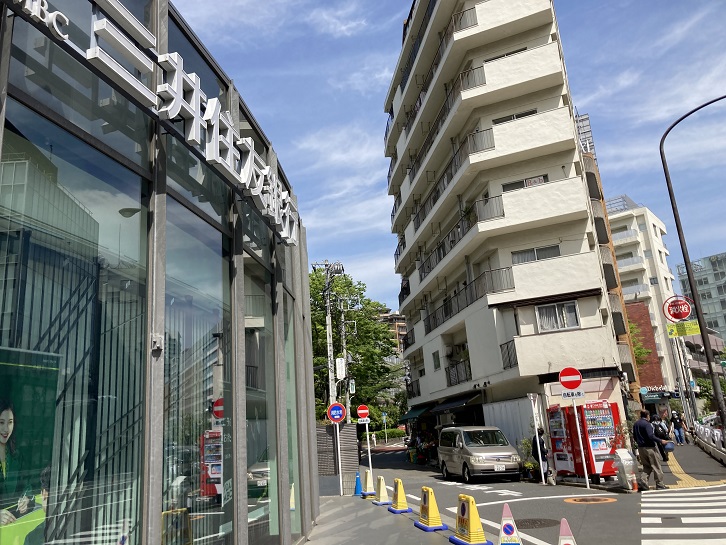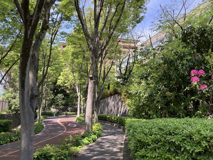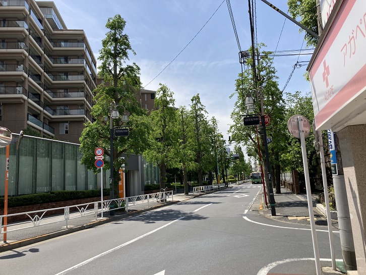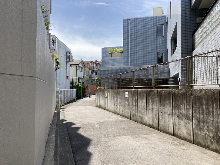 三井住友銀行の横で外苑西通りから脇道に入ります。更にその先で広尾ガーデンヒルズへと続く道から分岐して外苑西通りと平行する裏道を進みます。蛇足ですが、広尾ガーデンヒルズは、1972年にかっての堀田備中守の屋敷跡に位置する日本赤十字社医療センターが老朽化したため、日本赤十字社が敷地の半分に新しい病院棟を建設する目的で事業プロポーザルを実施し、住友不動産・三井不動産・三菱地所・第一生命保険の4社による共同事業体の提案が選定されたことに始まります。共同事業体が選定された理由は、計画案全体が住宅建設という公共性をもったプロジェクト内容で、日赤側の趣旨に見合ったものだったからです。当初のプロジェクトの全体計画案は、いずれも超高層の住居棟3棟(総戸数1000戸)を建設するというものでした。ところが、土地取得後の1年後に第一次オイルショックが発生し、それによって計画案は見直さざるを得なくなり、新規計画案では中高層住宅に変更されました。1982年11月、イーストヒルA・B・C棟の第1期分譲が開始され、翌年から順次入居を開始しました。最終的に1987年2月に全体が竣工しました。広尾ガーデンヒルズは、起伏に富んだ約6.6haの敷地に2〜3棟ごとに同じデザインコンセプトで建設された「ヒル(Hill)」と呼ばれる単位に分けられており、5つの「ヒル」に全15棟・合計1,181戸が設けられたほか、管理センター・スーパーマーケット(ナショナル麻布)・銀行ATM・医院も配置されました。また各ヒルには共有部分として遊歩道や庭園が設けられ、植栽スペースが広がり、設置率75%の駐車場の大半が建物と庭園の地下に設けられています。東京ではよく知られた超高額のいわゆる「ヴィンテージ・マンション」の筆頭格であり、緑豊かで落ち着いた住環境の良さなどが評価され、竣工以来現在まで中古市場で高い人気を維持しています。