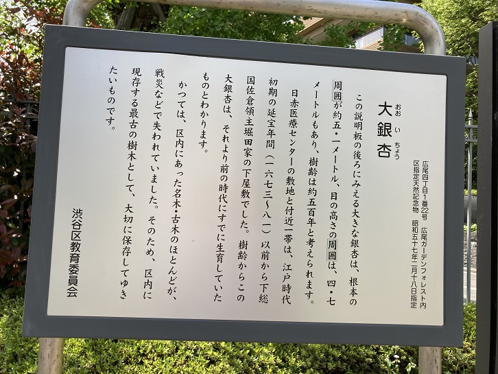 この説明板の後ろにみえる大きな銀杏は、根本の周囲が約5.1メートル、目の高さの周囲は、4.7メートルもあり、樹齢は約五百年と考えられます。日赤医療センターの敷地と付近一帯は、江戸時代初期の延宝年間(1673年〜1681年)以前から下総国佐倉領主堀田家の下屋敷でした。樹齢からこの大銀杏は、それより前の時代にすでに生育していたものとわかります。かつては、区内にあった名木・古木のほとんどが戦災などで失われていました。そのため、区内に現存する最古の樹木として、大切に保存してゆきたいものです。
