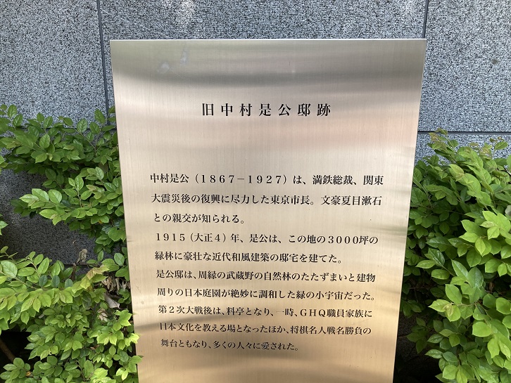中村是公(1867年〜1927年)は、満鉄総裁、関東大震災後の復興に尽力した東京市長。文豪夏目漱石との親交が知られる。大正四年(1915年)、是公は、この地の3000坪の緑林に豪壮な近代和風建築の邸宅を建てた。是公邸は、周縁の武蔵野の自然林のたたずまいと建物周りの日本庭園が絶妙に調和した緑の小宇宙だった。第二次大戦後は料亭となり、一時、GHQ職員家族に日本文化を教える場となったほか、将棋名人戦名勝負の舞台ともなり、多くの人々に愛された。
