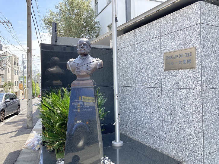 山種美術館に向う坂道の途中にペルー大使館があります。敷地の一画にいかめしい顔の軍人らしき銅像が置かれています。説明板にはスペイン語で短い言葉が添えられていますが、ちょっとだけスペイン語を囓った経験から、次のような内容であったと推測されます(あくまで推測です)。
