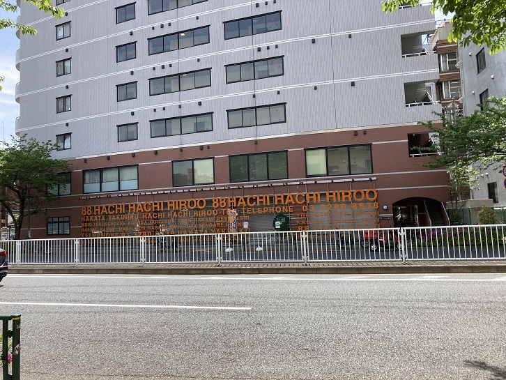 再びいもり川跡の遊歩道(殆ど路地)に戻り、明治通りに出ます。本当は東北寺にも寄りたかったのですが、場所がわかりませんでした。明治通りの手前に臨川小学校がありますが、校名の通りかってはいもり川に臨んでいました。いもり川は明治通りを渡った先で渋谷川に合流していたとのことです。明治通りから広尾駅に向う道の分岐点近くに、「88HACHIHACHIHIROO」と大書きした建物があります。前々から気になっていたのですが、よくよく見ますと、「HAKATA YAKINIKU」と書いてあります。焼肉屋さんだったんですね。おしゃれな空間で最高のお肉をリーズナブルに楽しめるというのがキャッチフレーズだそうです。焼肉って、博多の名物だったのかな?