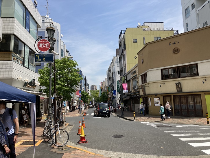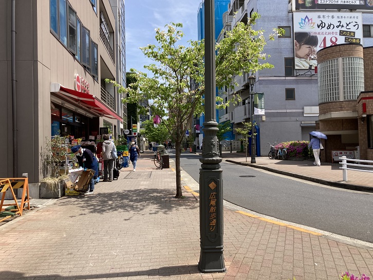 明治通りから分岐し、広尾駅に向う商店街の道路は「広尾散歩通り」という名前が付いています。クランク状に曲っているのが特徴です。「鍵の辻」と呼ばれる城下町で敵兵の進攻を食い止めるための道路みたいです。今では誰でもウエルカムですが。