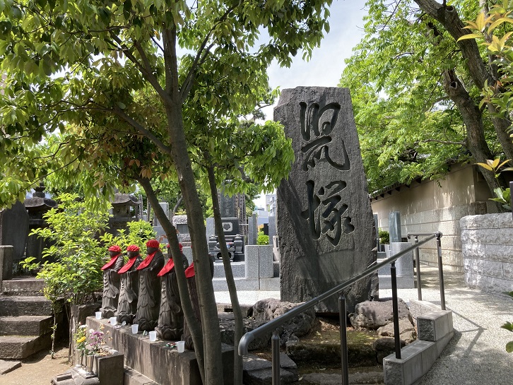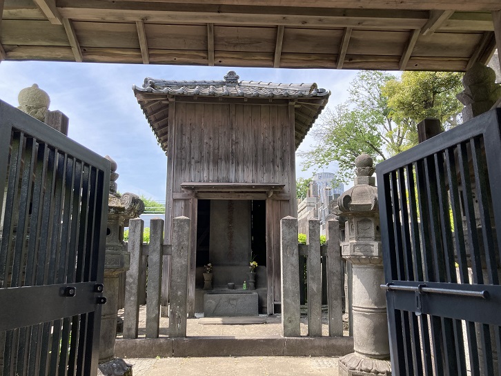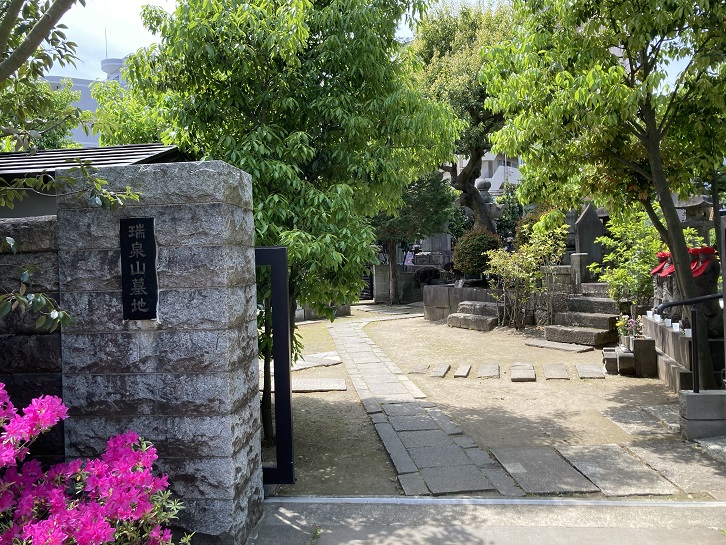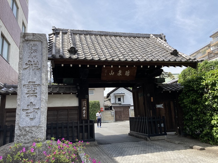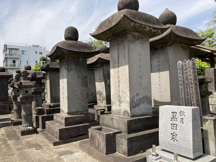 で、祥雲寺の境内に入ります。豊臣秀吉の天下統一に貢献した福岡藩主黒田長政は京都紫野大徳寺の龍岳和尚に深く帰依していたために、 元和九年(1623年)に長政が没すると、嫡子忠之は龍岳を開山として赤坂溜池の自邸内に龍谷山興雲寺を建立しました。寛文六年(1666年)には麻布台に移り、瑞泉山祥雲寺と号を改め、 寛文八年(1668年)の江戸大火により現在の地に移りました。長政の墓は墓標形として建てられた雄大なものです。祥雲寺の檀家には武家が多かったため、福岡藩主黒田家をはじめとして福岡藩の分家秋月藩主黒田家・久留米藩主有馬家・吹上藩主有馬家・柳本藩主織田家・岡部藩主安倍池・小野藩主一柳家・狭山藩主北条家・園部藩主小出家など諸大名の墓地群があります。