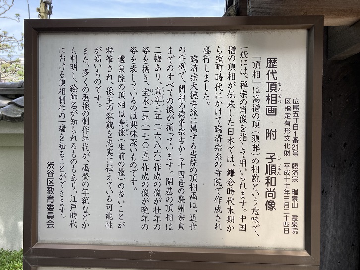 「頂相」は高僧の頂(頭部)の相貌という意味で、一般には、禅宗の肖像を指して用いられます。中国僧の頂相が伝来した日本では、鎌倉時代末期から室町時代にかけて臨済宗系の寺院で作成され盛行しました。臨済宗大徳寺派に属する当院の頂相画は、近世の作例で、開祖の徳峯宗古から十四世の廉州宗貞までのすべての像が揃っています。開基の頂相は二幅あり、貞享三年(1686年)作製の像が壮年の姿を描き、宝永二年(1705年)作成の像が晩年の姿を表しているのは興味深いものです。霊泉院の頂相は寿像(生前の像)の多いことが特筆され、像主の容貌を忠実に伝えている可能性が高いものです。また、多くの画像の制作年代が、画賛の年紀などから判明し、絵師名が知られるものもあり、江戸時代における頂相制作の一端を知ることができます。