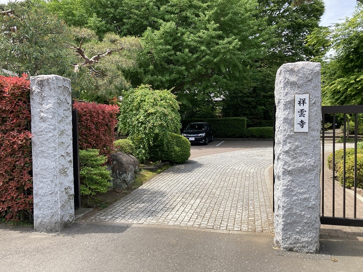 何故道路がクランク状になっているのかというと、祥雲寺の敷地に沿って造られた道路だからです。祥雲寺は、広尾五丁目にある臨済宗大徳寺派の瑞泉山という山号の寺院で、広尾駅のすぐ傍の広尾商店街の突き当りに位置しています。渋谷区最大の巨刹で、江戸時代初期に筑前福岡藩主・黒田忠之が黒田藩赤坂江戸中屋敷内に父の黒田長政を弔うために建立したのが始まりです。以後、広尾に寺地を移転し、福岡藩や黒田家に縁のある数々の大名家や武家の墓所となっていることで知られています。筑前福岡藩二代藩主黒田忠之が元和九年(1623年)に赤坂溜池の福岡藩中屋敷(赤坂二丁目の赤坂ツインタワー一帯)内に江戸における黒田家菩提寺として創建され、当初は長政の戒名より竜谷山興雲寺と号しました。長政が生前帰依していた京都大徳寺の164世住持だった竜岳宗劉和尚により開山されました。江戸時代を通じて関東における同派の最高位寺院の触頭(ふれがしら)でした。境内裏手墓所には屋根で覆われた黒田長政の6メートル程の巨大な墓標があり、渋谷区指定史跡となっています。その他、長政の正室だった大凉院栄姫・息女亀子姫など黒田家と同家に連なる人物の墓所が多数あります。祥雲寺境内に残る東江寺・霊泉院・香林院は江戸時代を通して祥雲寺の塔頭(たっちゅう:禅宗寺院で祖師や門徒高僧の死後その弟子が師の徳を慕い大寺・名刹に寄り添って建てた塔(多くは祖師や高僧の墓塔)や庵などの小院をいいます。門徒らによって立ち並ぶ塔の中でも首座に置かれたこと、あるいは門徒らが塔のほとり(「頭」)で守ったことから塔頭と呼ばれたなどの説があります。塔中・塔院・寺中・院家ともいいます。)でした。現在は、祥雲寺からは独立しているものの、関係は深く現在も移転せず祥雲寺の境内や山門内に立地しています。